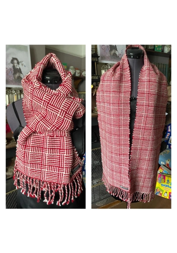 This beautiful handwoven cherry red and cream scarf will certainly brighten up any winter coat, and keep you warm and cozy at the same time! Carefully woven in the 'Log Cabin' pattern, it is made from an 80% acrylic/20% wool mix, and measures approx 72" x11", with a 3" twisted fringe.